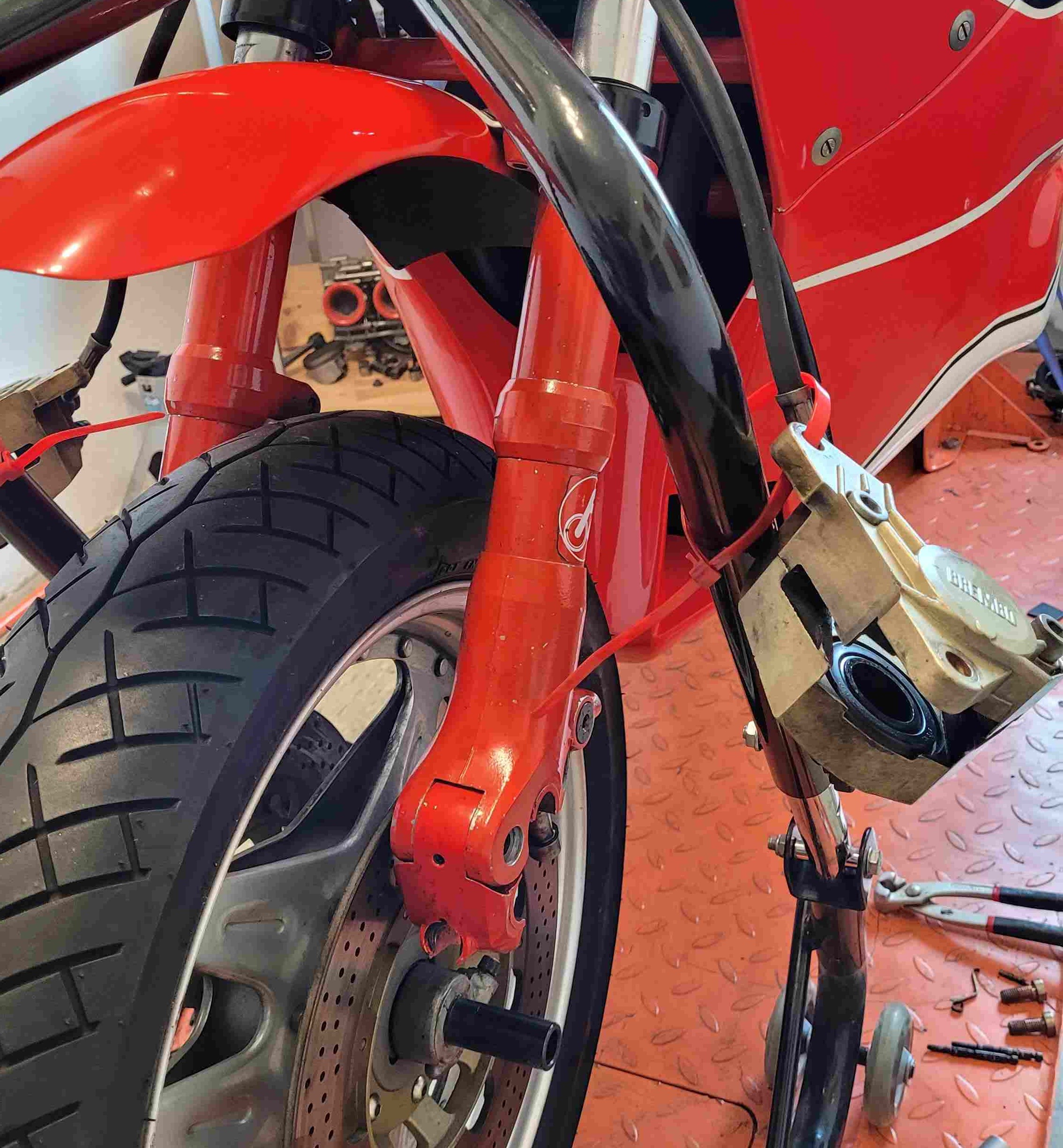 On this KB2, the fairing didn’t even need to be removed. Loosen the front axle, unbolt the brake caliper, position the fork lift, remove the front wheel, loosen the clamps on the triple trees, and pull out the fork legs – done.
