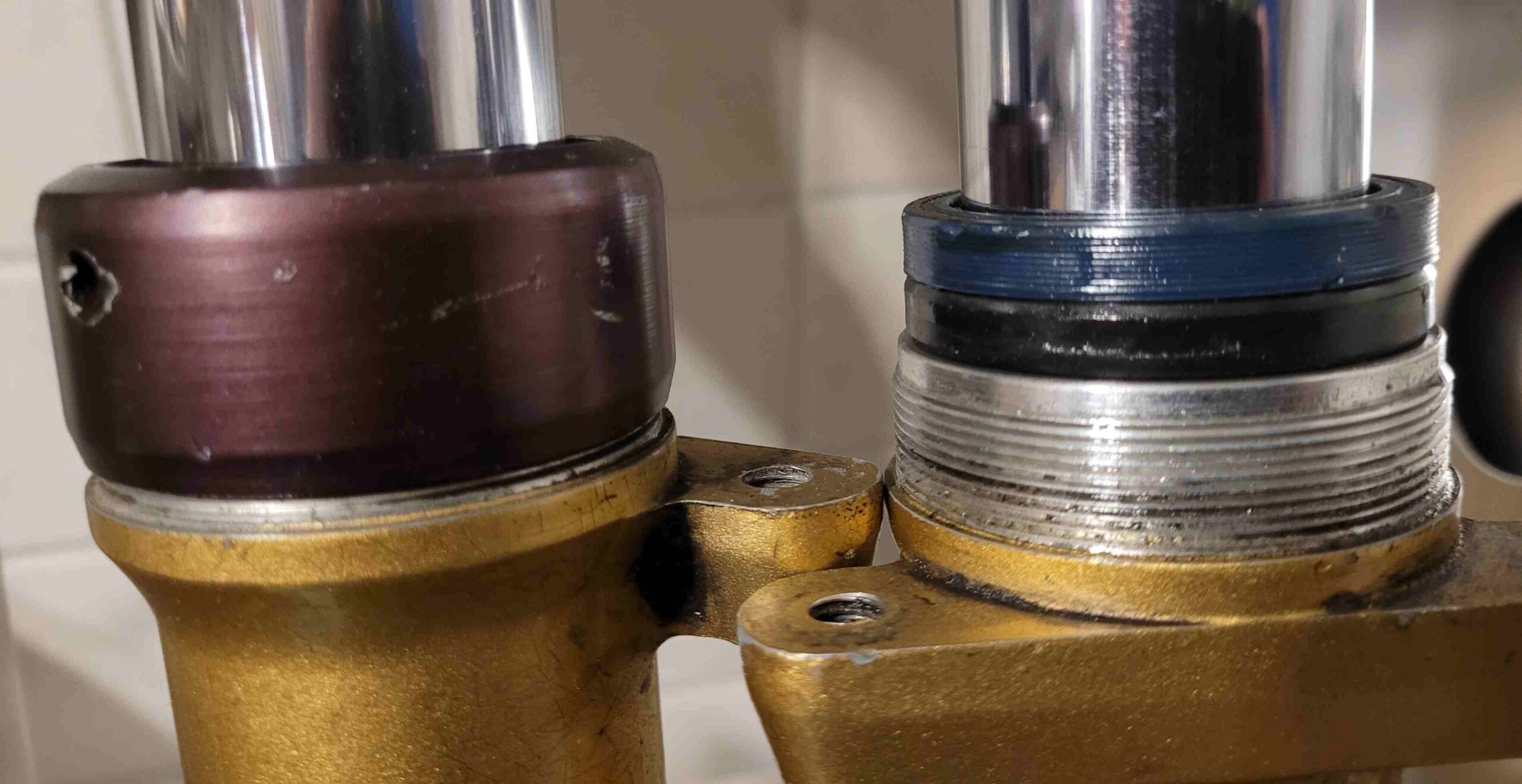 Some fellow Bimota mechanics have even had new threaded caps made to allow the use of 40 × 10 seals and dust caps. My tip: install two 40 × 7.5 seals on top of each other. At 15 mm, they are slightly taller than the original, but the thread of the screw cap is long enough to secure them safely.